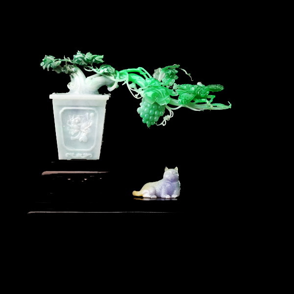 冰种,八分色,八分水,十分工。全物栩栩如生,绿葡萄晶莹剔透,酸味涌心头。其雕工堪称一绝,“长寿之物”玉猫活灵活现神态可掬,玉蝉展翅欲飞,扶摇直上入云霄,动感十足,一鸣惊人,如闻其声。色是绝俏,形是精湛之艺,物自然是难得之宝。